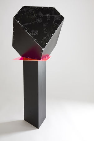 Aluminium, acrylique, MDF, 110 x 47 x 52 cm, 2023. Avec Mathilde Bois (co-écriture des textes).